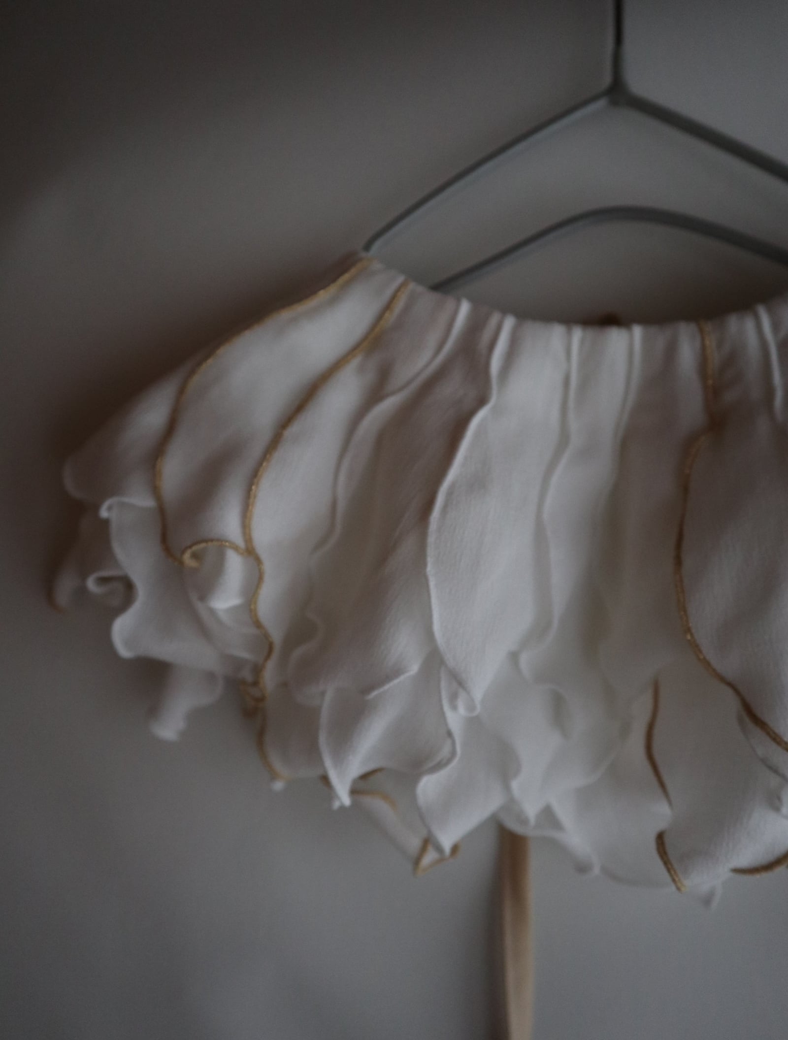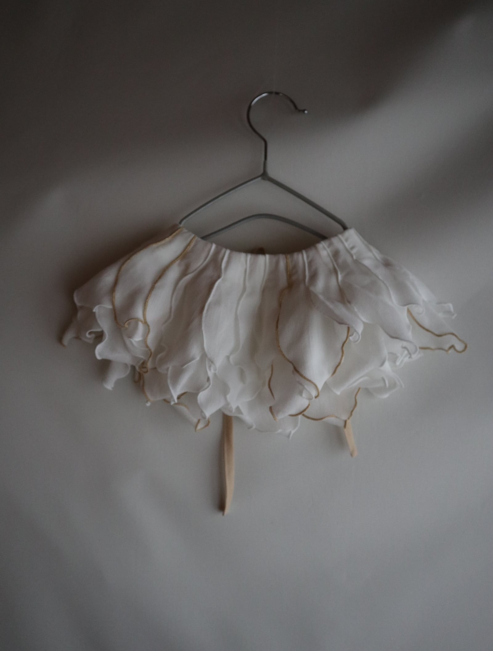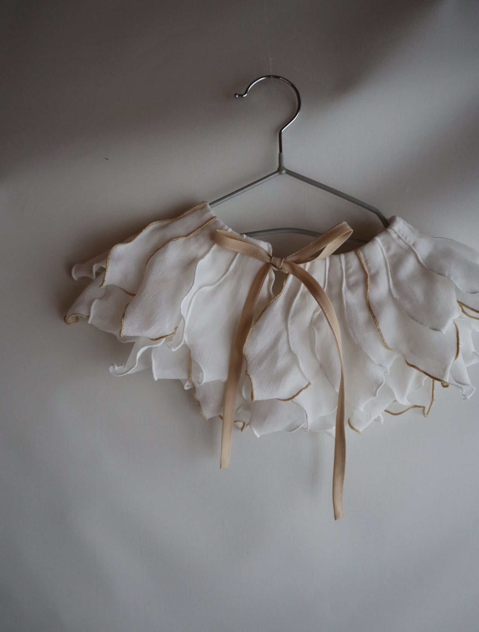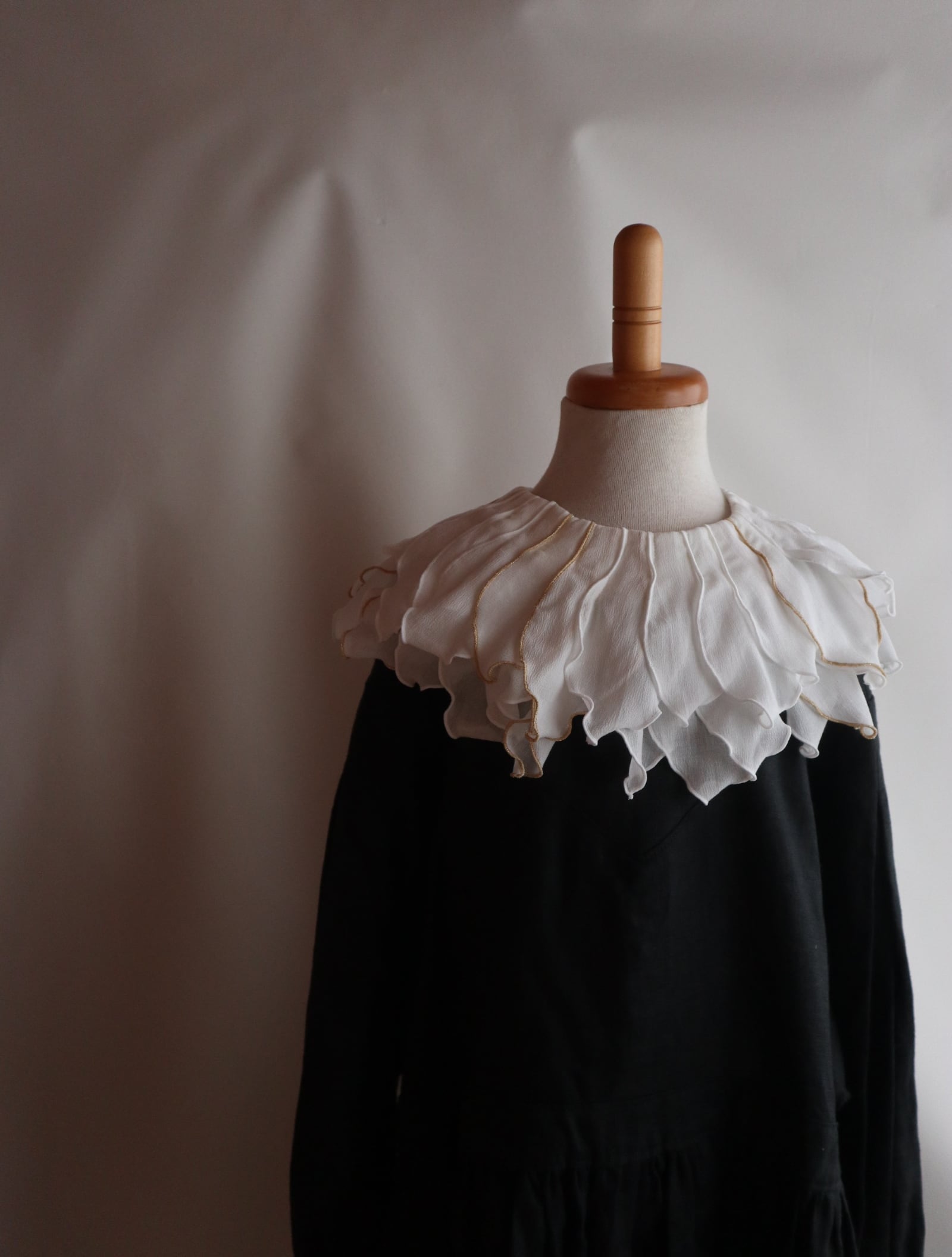peonyは、まるでお花を首元に飾っているような印象のつけ襟。たくさんの花びらのモチーフ1つ1つバランスをみながら配置しております。