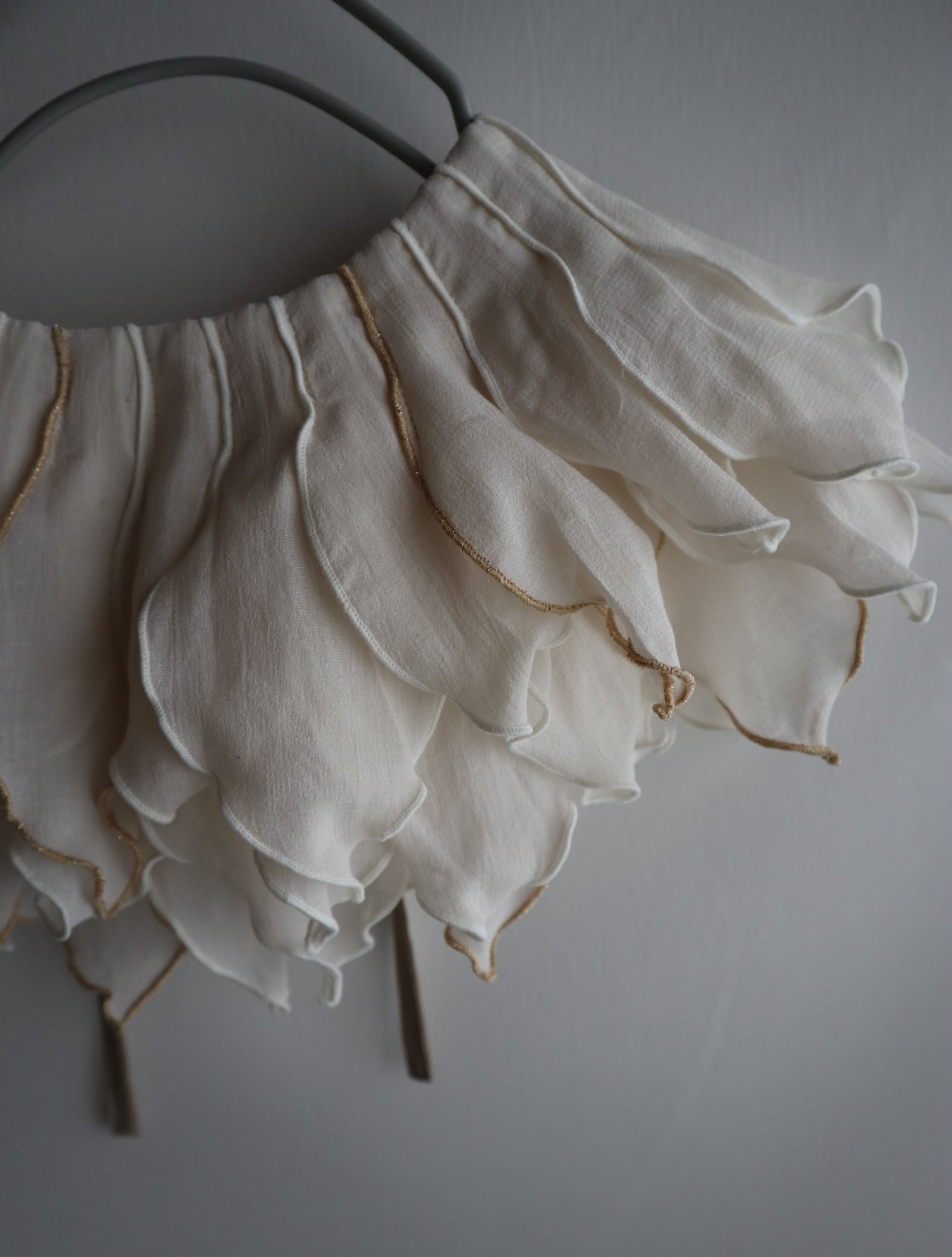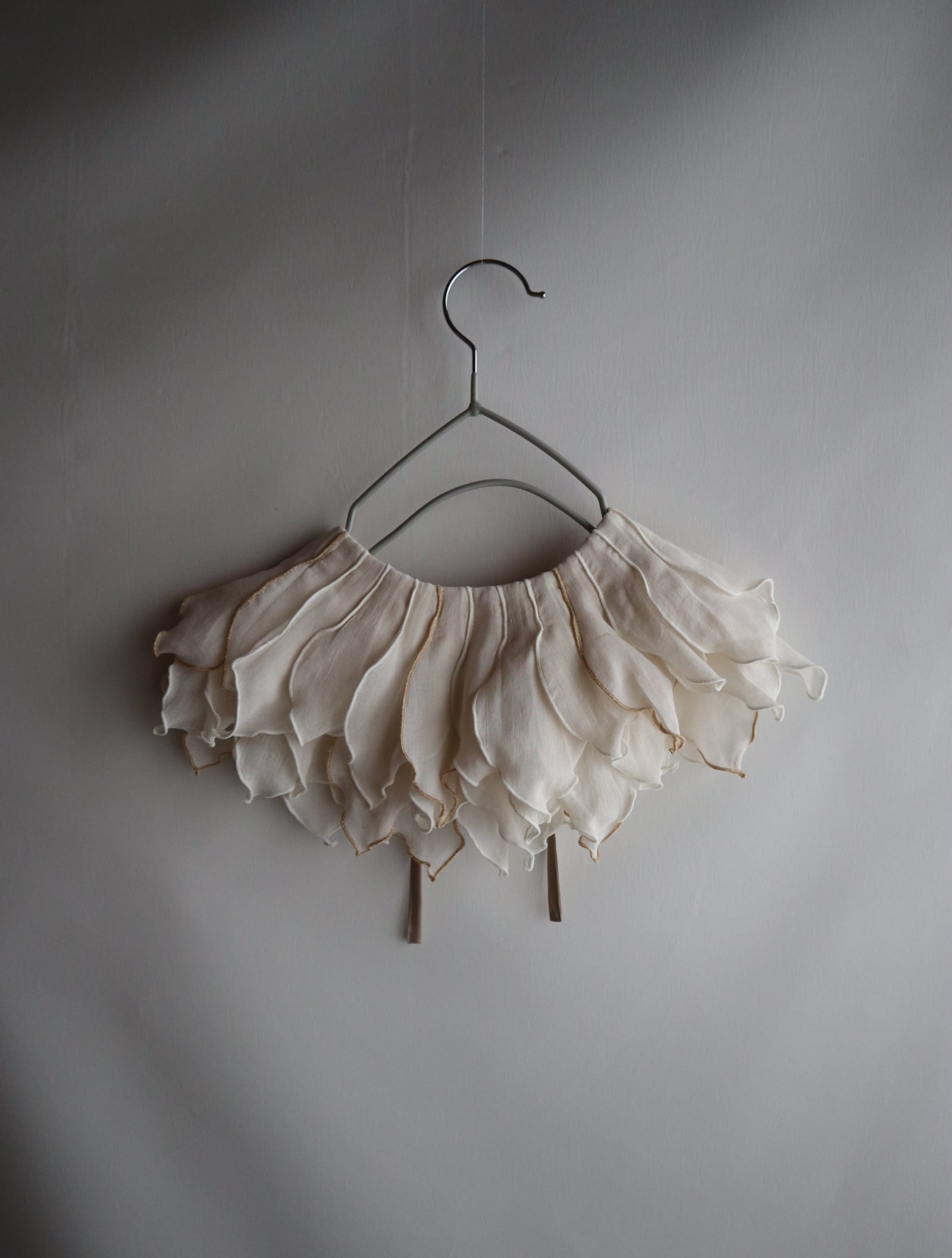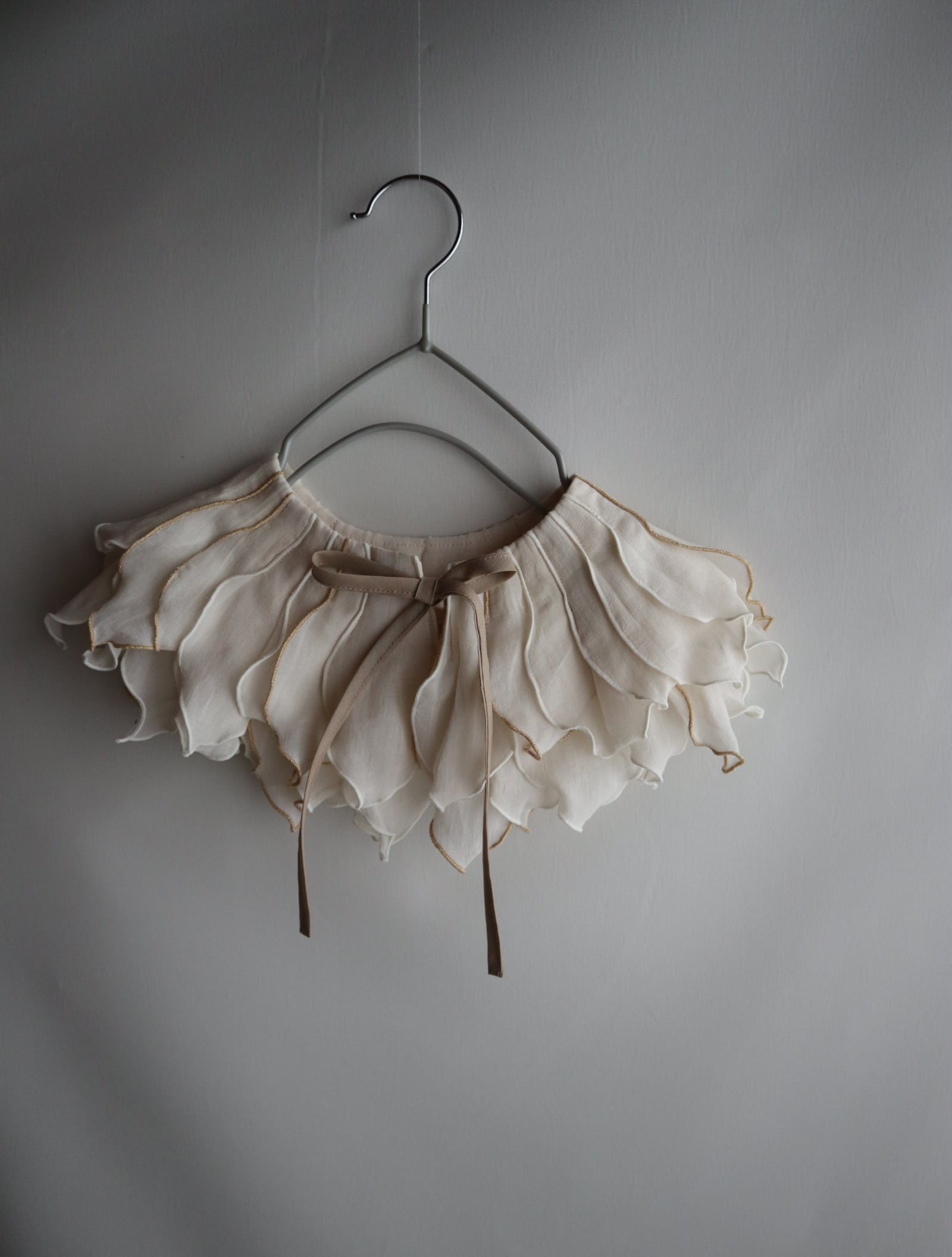 peonyは、まるでお花を首元に飾っているような印象のつけ襟。たくさんの花びらのモチーフ1つ1つバランスをみながら配置しております。