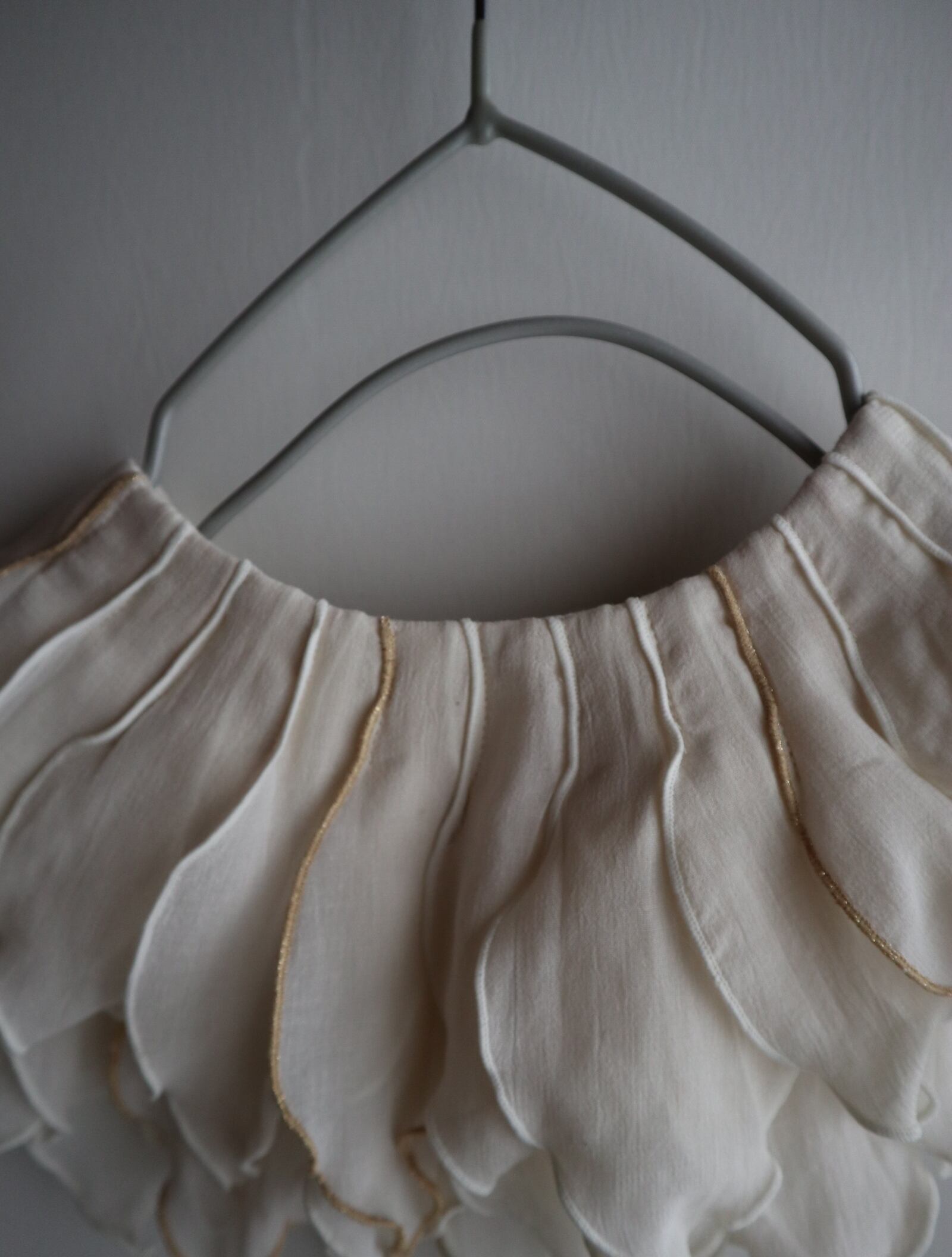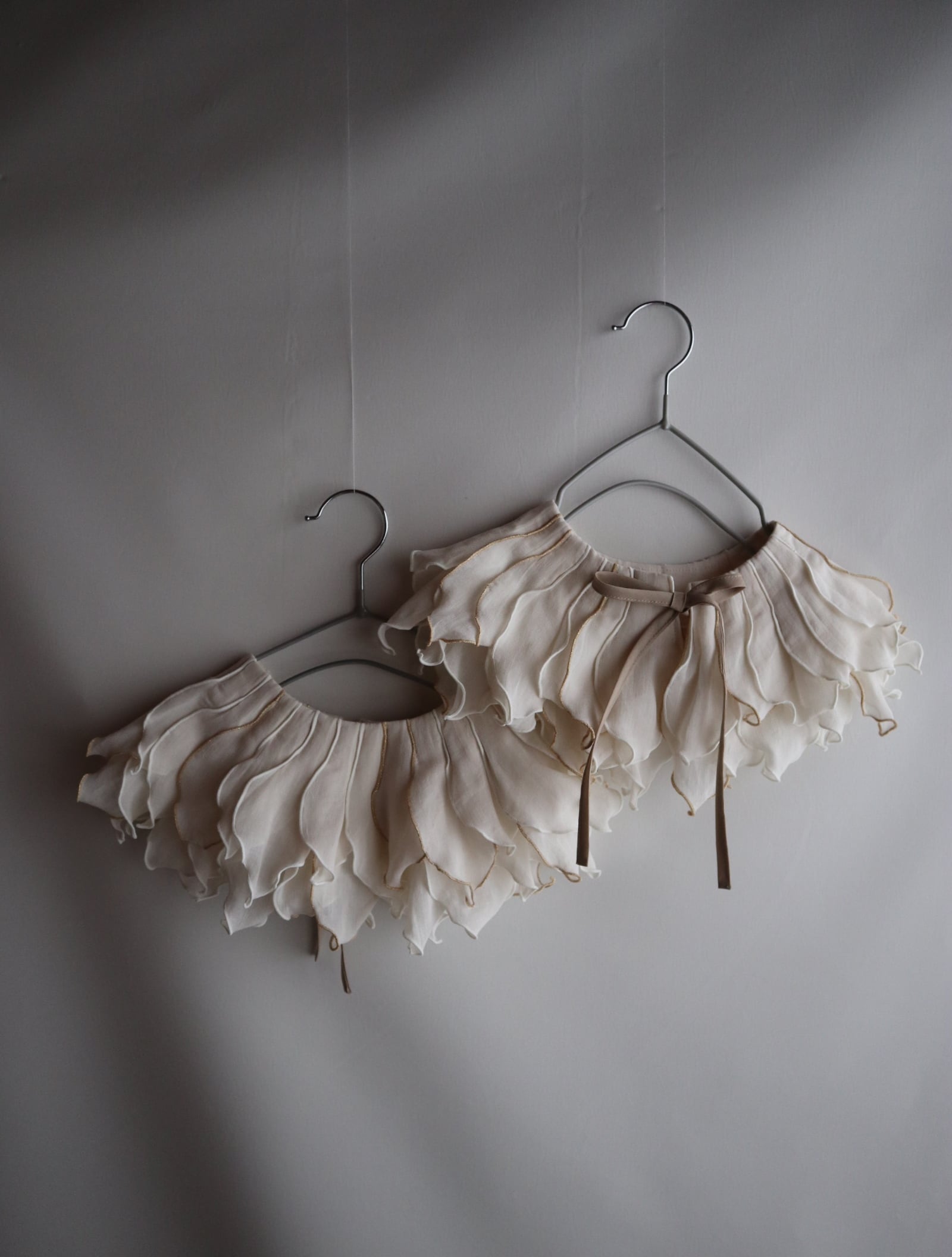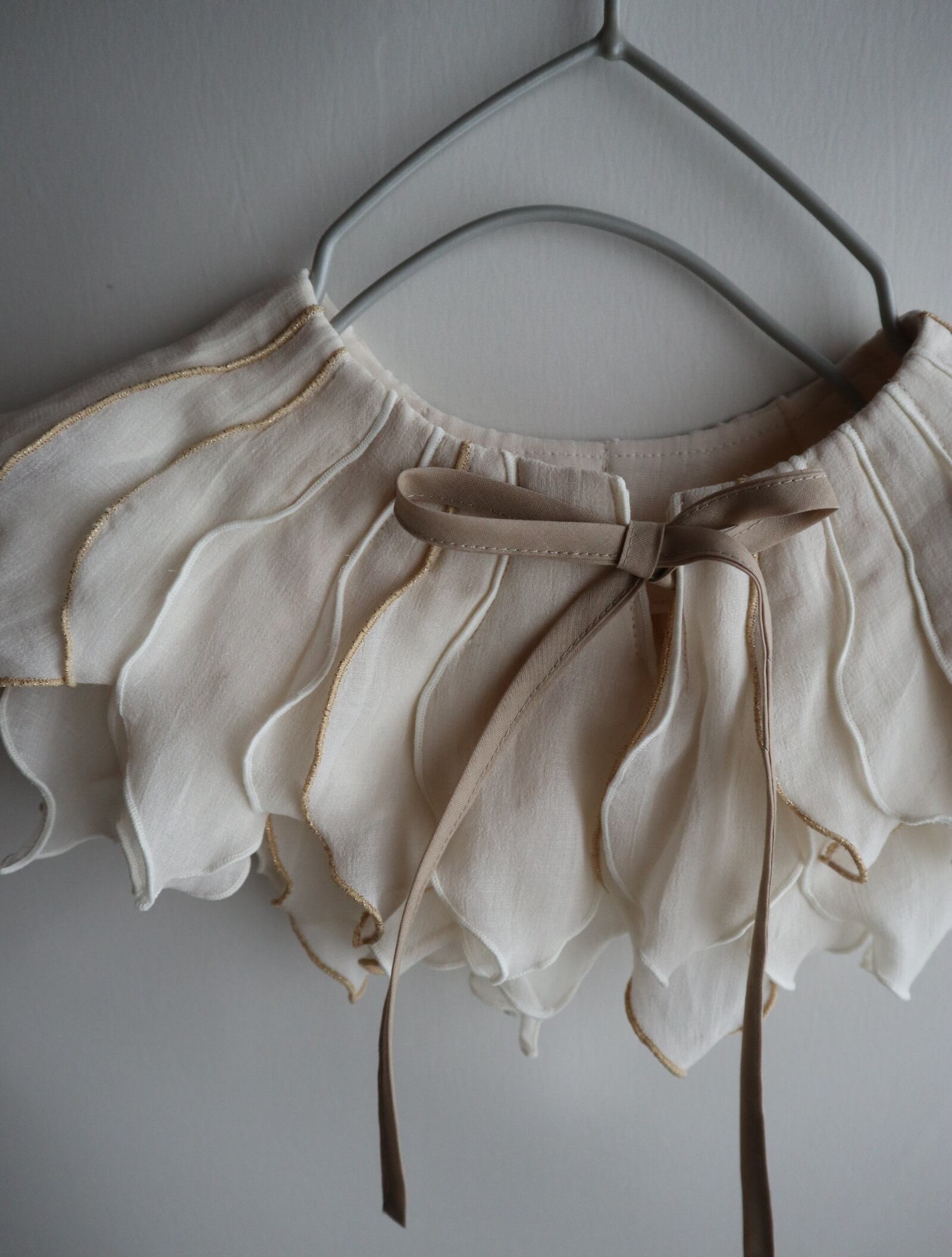 peonyは、まるでお花を首元に飾っているような印象のつけ襟。たくさんの花びらのモチーフ1つ1つバランスをみながら配置しております。